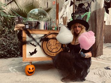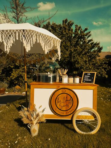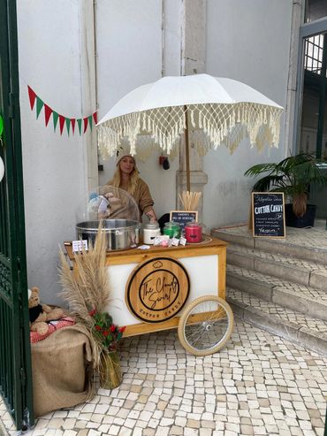 Cotton candy cart with boho decoration and a boho umbrella at the festival